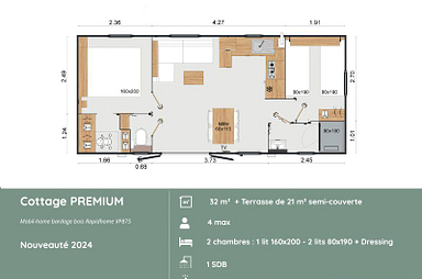 Entdecken Sie unser PREMIUM Cottage, die perfekte Verbindung von Modernität und Natur. Diese 32 m² große Unterkunft besticht durch ihr Hauptschlafzimmer mit Queen-Size-Bett und ihren großzügigen Außenbereich mit einer halbüberdachten 21 m² großen Terrasse und privatem Garten. Die hochwertige Ausstattung, einschließlich Geschirrspüler und Ankleidezimmer, garantiert einen komfortablen Urlaub für 4 Personen.